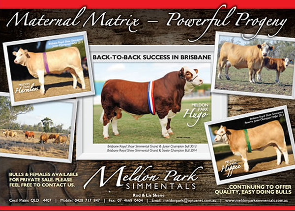 Meldon Park Hugo wins Senior Champion and Grand Champion, runner up Beef Champion Interbreed at Beef Week. Meldon Park Knockout wins Calf Champion Heifer; Meldon Park Hippie Senior Champion Cow and Grand Champion Female; Meldon Park Juggler was awarded Junior champion Simbrah bull. Meldon Park Hippee (P) won Senior and Grand Champion cow at Ekka. Meldon Park Knockout won Junior Heifer. Meldon Park Jundah (P) won Junior Champion Bull. Meldon Park held their first bull sale at Billabong, Moura. Meldon Park Jundah (P) topped the sale at $20000, 100% clearance.